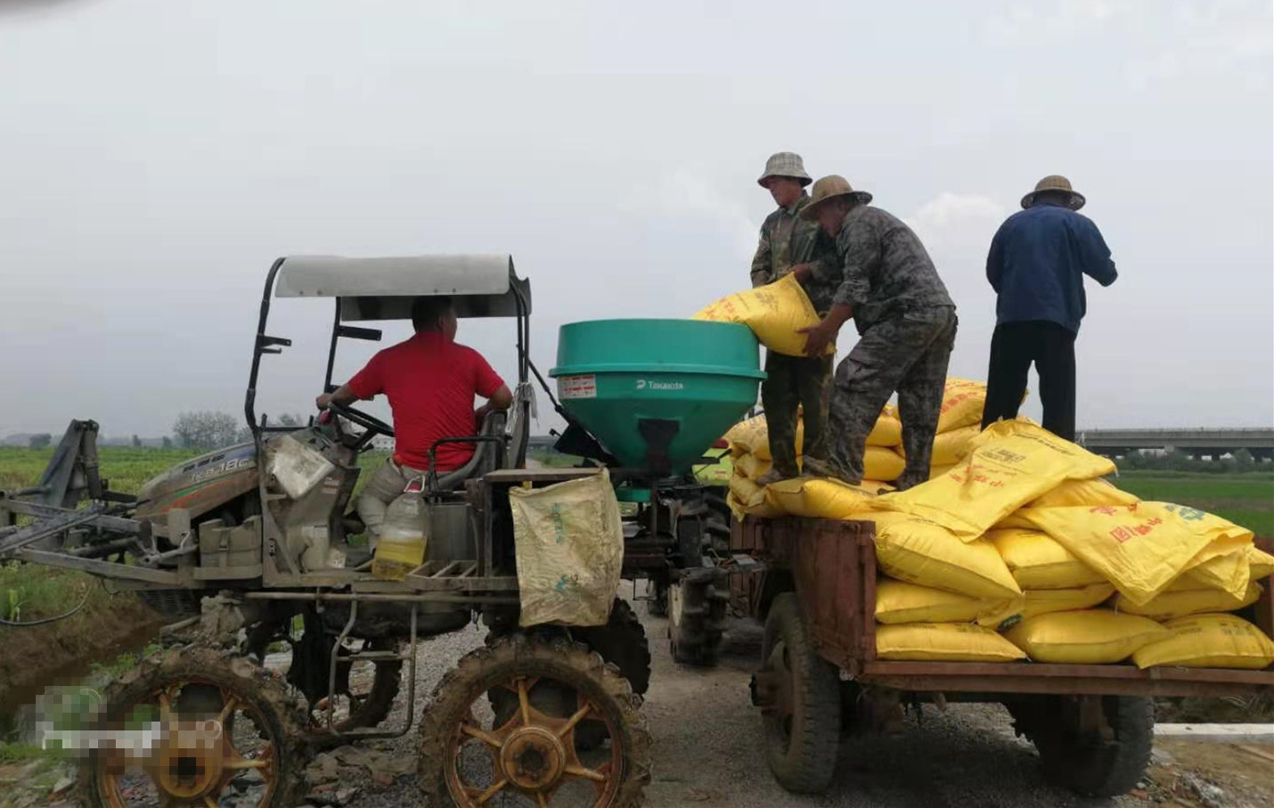 近日,淮南农场公司针对1.67万亩在地作物受灾不同等级及长势情况,印发了3期病虫情报和5期技术明白纸,积极动员家庭农场抢抓短暂晴好天气,见缝插针,做好病虫害的防治和科学肥水运筹等关键农技措施的落实,力求把水灾损失降到最低。图为 7月31日,淮南农场公司规模种植公司在给水稻田间施肥打药。(李超)